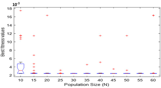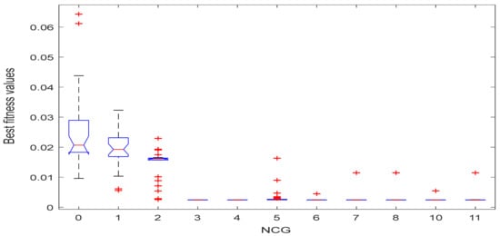 RGNDO has a single parameter, NCG, which needs to be optimally adjusted to maximize the performance of the RNGDO. NCG is defined as the lower bound of the number of times each individual could find a worse solution than the last best one. To efficiently extract this parameter, the performance of RNGDO under different values (0, 1, 2, 3, 4, 5, 6, 7, 8, 10, and 11) within 30 independent times is depicted in Figure 3. According to this figure, the best value for NCG is 3 or 4. As a result, a value of 3 is used for NCG within our experiments. The second most important parameter with a major effect on the performance of the proposed algorithm is the population size: a large population size will increase the diversity among the members, reducing the possibility of reaching the optimal solution; a small population size skips a lot of the regions within the search space, which may include the promising solution. Hence, an extensive experiments are conducted to estimate the best value for this parameter and depicted in Figure 4 that confirms that a value of 30 is the best for the parameter N.