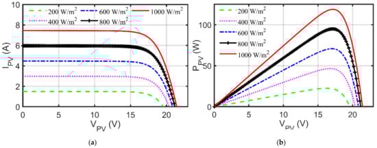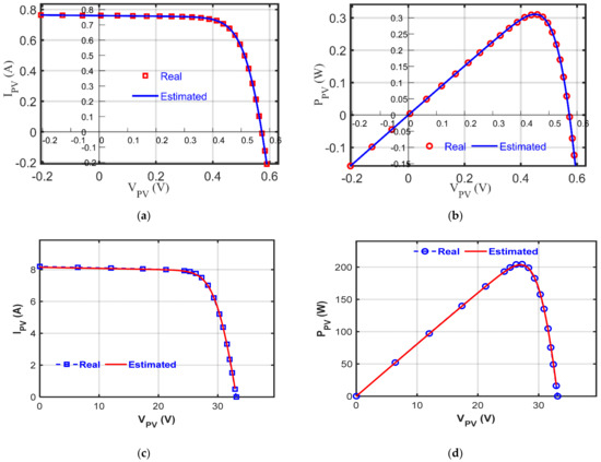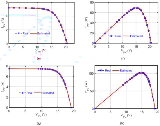 Due to space limitations, STP6-20/36 is used as a representative demonstration. The values of Ki and Kv are equal to 0.065%/°C and −0.346%/°C, respectively, for this module. After passing the obtained optimal settings of the nine parameters as depicted in Table 9 generated by RGNDO, the various principal characteristics are illustrated in Figure 10, which shows the five levels of sun irradiances in Figure 10a,b at a fixed temperature of 25 °C. Figure 10c,d reveals the principal characteristics for four levels of temperature at 1000 W/m2.