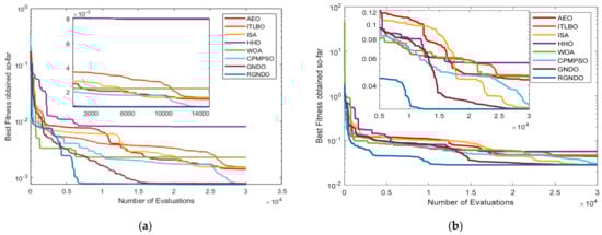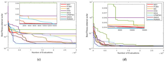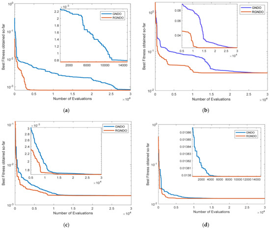 Convergence curves were obtained for GNDO and RGNDO: (a) Convergence on RTC France; (b) Convergence on Kyocera KC200GT; (c) Convergence on Ultra 85−P; (d) Convergence on STP6−120/36.