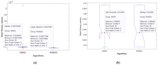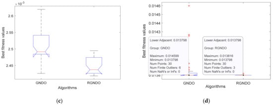 Boxplot achieved by GNDO and RGNDO: (a) Boxplot on RTC France; (b) Boxplot on Kyocera KC200GT; (c) Boxplot on Ultra 85−P; (d) Boxplot on STP6−120/36.