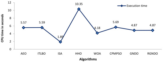 Figure 9 shows the CPU time (in seconds) required by each algorithm on RTC France. The figure shows that the CPU time is almost the same for all algorithms, with the exception of HHO, which takes a long time, and ISA, which takes less than half the time required by the remainder. RGNDO is therefore much more superior in terms of convergence speed and quality of the outcome, with negligible difference in CPU time.