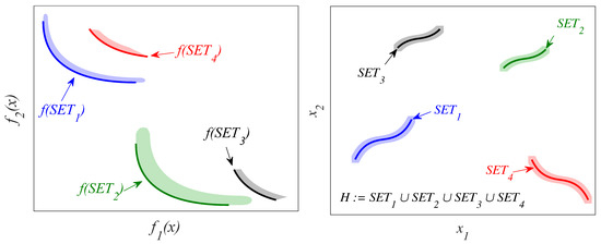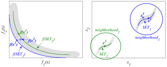 Figure 2 shows an example of a MOOP with two design objectives and two decision variables. Sets and form the global Pareto set. Both sets, together with and form the local Pareto set (since the global Pareto set is also a local Pareto set). No solution of a local Pareto set is dominated by a neighboring solution. Furthermore, all the solutions neighboring the local Pareto set are dominated by a neighboring solution, and therefore they are not part of this set. This can be verified by the colored areas around the sets , , and . For example, solutions in the gray area, which are neighboring solutions to , obtain a worse objective value than . For this reason, the solutions of the gray area are dominated by neighboring solutions, and therefore are not part of the local Pareto set. Sets and provide the DM with alternatives potentially useful (significantly different to and ), enabling the DM to make a more informed final decision. For this work, the dominated solutions (solutions that are not in the set ) will not be considered to be local Pareto solutions (H) because their degradation in performance is significant for the DM.