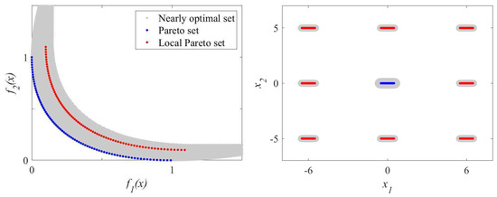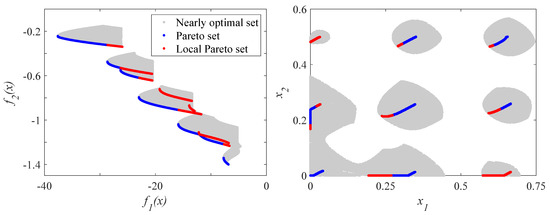 The benchmark 2 (see Equation (21)) is an adaptation of the modified Rastrigin benchmark [51,52,53,54]. Figure 4 show the global and local Pareto set H of benchmark 2. This benchmark has a discontinuous Pareto front made up of solutions in different neighborhoods. In addition, it also provides nearly optimal solutions significantly different from the optimal solutions (in different neighborhoods).