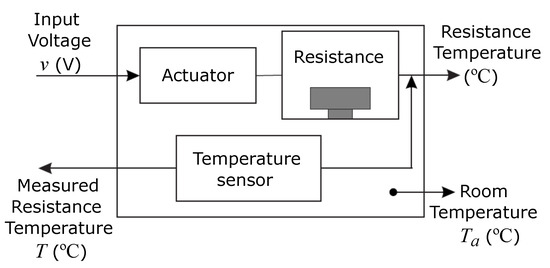 Finally, a MOOP is defined to solve a real engineering problem: identification of a thermal system. In this problem, the energy contribution inside the process is due to the power dissipated by the resistance inside it (see Figure 5). Air circulation inside the process is produced by a fan, which constantly introduces air from outside. The actuator is made up of a voltage source which is controlled by voltage. The actuator input range is % ( V). Two thermocouples are used to measure the resistance temperature and the air temperature in the range C. Figure 6 shows the signals that will be used in the identification process. The ambient temperature is considered constant and equal to 17 C for the entire identification test.