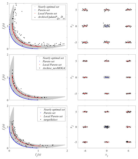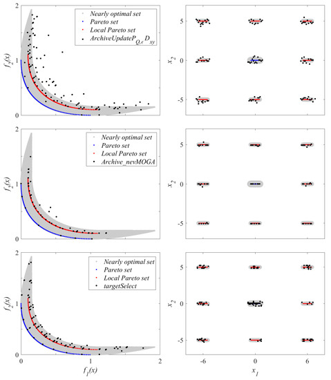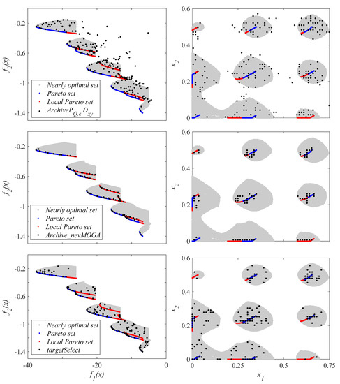 The archive A, with the median result (in the decision space), for each archiver is shown in Figure 11. The archivers locate the neighborhoods where nearly optimal solutions are found. The archive of again obtains fewer solutions. Keep in mind that decreasing for causes a considerable increase in the variability of the results obtained for the 25 tests. obtains a better approximation to the Pareto front due to the high value of the weight . However, obtains solutions closer to the local Pareto set. This is because seeks to achieve the greatest diversity in the decision space (through ) without taking into account whether these solutions are worse than a close solution (if they are not optimal).