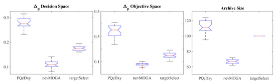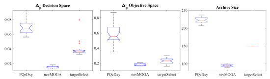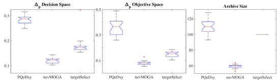 Figure 12 shows the boxplot, of the 25 archives obtained for the archivers, for the indicator in the decision and objective spaces and the archive size. Regarding the decision space, obtains a better approximation to the target set than its competitors. Regarding the objective space, and obtain a similar minimum value. However, obtains worse variability. Therefore, as occurred with benchmark 1, the archiver achieves a better approximation in both spaces and obtains a smaller number of solutions.