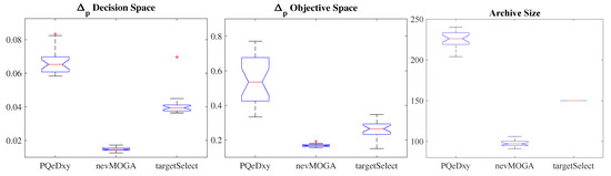 is an indicator that measures diversity and convergence to the Pareto front, and is an indicator that measures diversity in the decision space. In this work, as in [10], and were specified by the hypervolume indicator [45] and the Solow–Polasky diversity measure [46], respectively. An advantage of the archiver is that you can directly and arbitrarily specify the archive size.