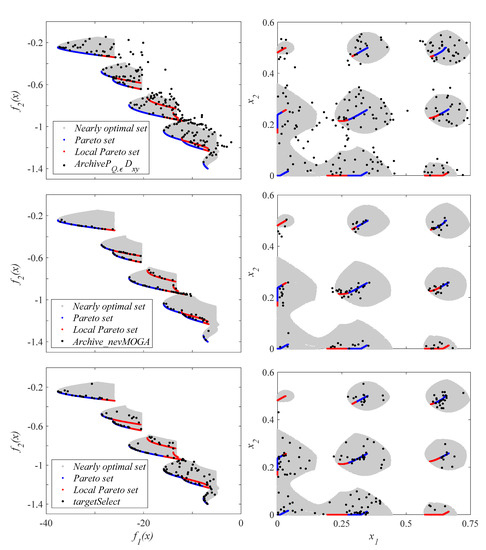 The three archivers obtain the existing diversity in the set of optimal and nearly optimal solutions. In this last example, we can see how the archive obtained by obtains a very high number of solutions, complicating the optimization and decision stages. and obtain the same number of solutions. Both archivers obtain an adequate Pareto front. However, gets more diversity on the Pareto front. The main difference between the two archivers is in the set of nearly optimal solutions. On the one hand, obtains solutions closer to the Pareto front, but significantly different in the decision space. On the other hand, obtains the solutions that provide the greatest diversity in the decision space, even though these solutions are farther away from the Pareto front, and therefore, offer significantly worse performance.