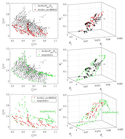 focuses on obtaining, in addition to a good convergence in the Pareto front, the greatest diversity in the decision space (using , see Section 4.3). However, solutions that provide greater diversity may be worse than neighboring solutions. For example, Figure 15 shows the solution obtained by . This solution has similar parameters to the solutions (see decision space). performs better () than all the solutions obtained by . Therefore, would eliminate all these solutions (dominated in its neighborhood by ). maintains them because they increase the diversity in the decision space. This happens repeatedly in this MOOP. For this reason, obtains nearly optimal solutions farther from the Pareto front than obtained by . These solutions are in the contour/ends of the plane that form the optimal and nearly optimal solutions in the decision space, and therefore, they obtain a better diversity under the indicator. could find solutions closer to the contour/ends of the plane formed in the decision space (as is the case with ) by reducing the parameter , although this would imply obtaining a larger number of solutions. Therefore, depending on the needs or preferences of the DM, the use of one archiver or another may be more appropriate. This archiver can be embedded in most of the multi-objective algorithms available. , and archivers are currently built into the algorithms NSGA, and respectively.