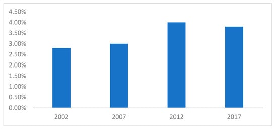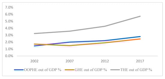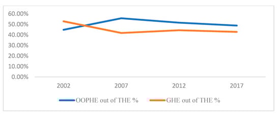 Figure 3 and Figure 4 show the change in OOPHE as a percentage of GDP and as a percentage of Total Healthcare Expenditure (THE), respectively, over the period 2002 to 2017. It is noted from both figures that after 2002, OOPHE has surpassed Government Healthcare Expenditure (GHE). While the total number of inpatient admissions in government hospitals rose slightly from 186,424 in 2003 to 199,079 in 2018, total number of admissions in private clinics rose by ten-fold from 27,916 in 2003 to 263,376 in 2018. The above trend indicates the shift in the significance of healthcare financing from the public sector to the private sector. If these trends persist, they can erode the willingness to pay of the middle class and the rich to pay taxes for public healthcare services, as they may increasingly opt out of the public healthcare system. This can act as a threat to the sustainability of free public healthcare []. From a policy perspective, the government may consider improving nonclinical aspects of public healthcare quality by adopting quality improvement strategies. The results have general implications for emerging countries with a free healthcare policy.