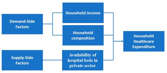 In addition to income, the study uses a similar conceptual framework to Kumara and Samaratunge [] by considering other demand-side and supply-side factors. In line with other studies, it includes household composition in addition to household income as a demand-side factor, as well as supply-side factors, represented by the availability of beds in the private sector as determinants of healthcare expenditure [,,]. The conceptual framework is provided in Figure 5. It is hypothesized that household income, household composition and availability affect household healthcare expenditure; this is to be tested in this study.