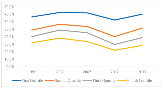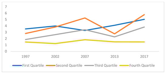 Table 4 provides summary of income elasticity of OOPHE from the Tobit Models corresponding to in Equation (A11). Figure 7 provides a diagrammatical illustration of the trend of income elasticity of OOPHE over time for each quartile and for the overall dataset. Consistent with some previous studies, the study finds that the relationship between income and OOPHE is not constant across all income quartiles [,].