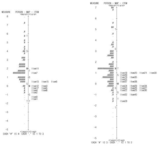 Rasch analysis was performed using a rating scale model. We analyzed item fit, person fit, item difficulty hierarchy, rating scale structure, and precision (person strata). In this study, the criteria for item and person misfit were set to infit or outfit mean square (MNSQ) of <0.6 or >1.4 with a z-standardized (ZSTD) value of <−2.0 or >2.0 [38,39]. For item difficulty, the differences in skills for the item were compared using a logit score, which is computed by converting the raw score obtained from an ordinal scale (Likert scale) into an interval scale, and by examining the order and interval of the difficulties of the item on a straight line [40,41]. For the rating scale analysis, the appropriate rating scale structure was set to: (1) a category count of ≥10, (2) vertical hierarchy, where average measure increases with an increased rating (monotonicity), and (3) outfit MNSQ < 2.0.