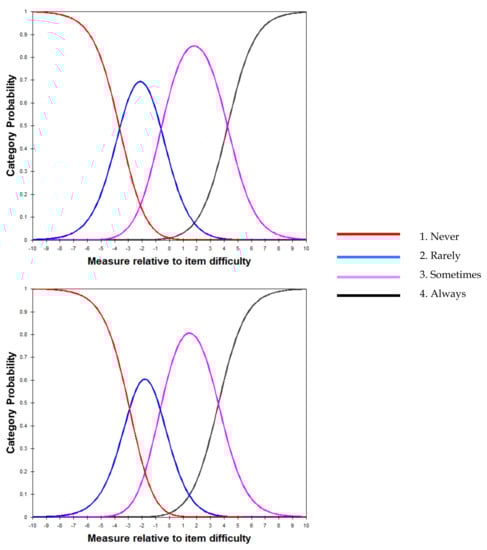 Regarding the rating scale, a four-point scale was found to be appropriate for both associative play and cooperative play areas, as confirmed by the even distribution of the probability curves of the rating scale, which confirms that the scale categories are independent [44]. This supports previous findings that a four-point rating scale is appropriate based on the children’s peer play behavior scale [45]. and the Korean version of the Social Skill Rating System for preschool level [46].