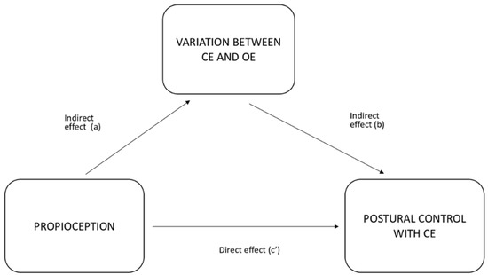 Using the analysis of the correlations among the different variables, values were calculated for a new variable based on the variation between the postural control results with open and closed eyes. Then, a simple mediation analysis model was used to examine the direct and indirect effects of proprioception as a predictor variable (PV) on postural control with closed eyes as a dependent variable (DV), through the mediation of the variation of the results with eyes closed with respect to eyes open (VAR_CE, a mediating variable) (MV). The associations established through this mediation analysis are shown in Figure 2.