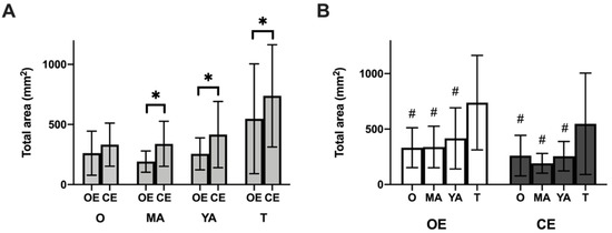 Scores on the balance test for the variable total area of center or pressure. (A) Comparison by testing conditions (open eyes vs. closed eyes) and (B) Comparison by age group. Lower values are associated with better performance on the task. O: Older adults; MA: middle-aged adults YA: young adults; T: teenagers; OE open eyes; CE: closed eyes. * p < 0.001. # post hoc differences only vs. the group of teenagers, p < 0.001.