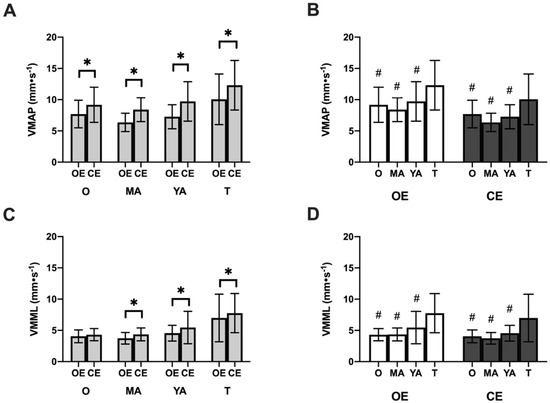 Scores on the balance test for the variable mean velocity of center of pressure. Mean front-to-back velocity: (A) Comparison by conditions (open eyes vs. closed eyes) and (B) Comparison by age groups. Mean velocity in medial-lateral direction: (C) Comparison by conditions (open eyes vs. closed eyes) and (D) Comparison by age group. Lower scores indicate better performance on the task. O: older adults; MA: middle-aged adults; YA: young adults; T: teenagers; OE: open eyes; CE: closed eyes; MVAP: media front to back velocity of the center of pressure; MVML: median medial lateral velocity of the center of presser. * p < 0.001. # post hoc differences only vs. the group of teenagers, p < 0.001.