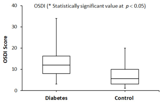 A side-by-side boxplot for the OSDI score within the study (diabetes) and the control (without diabetes) groups. * The difference in the OSDI median score was statistically significant at p < 0.05.