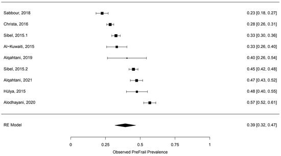 Forest plot of the observed pre-frail prevalence.