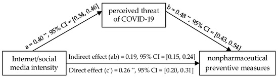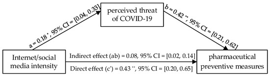 Finally, to test if results in the nonpharmaceutical condition could be replicated in the pharmaceutical condition (willingness to be vaccinated), we further conducted a mediation analysis with the PROCESS macro (version 4.0) to ascertain the mediation effect of the perceived threat of COVID-19 between internet/social media intensity and willingness to take pharmaceutical preventive measures (model 4; 5000 bootstrapped samples) [37]. Age, gender, education, and subjective socioeconomic status were included as covariates.