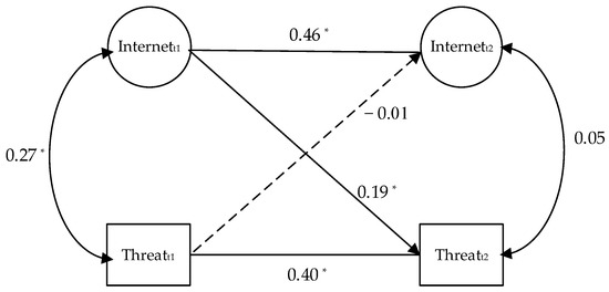 Result of the cross-lagged analyses of the relationship between internet/social media intensity and the perceived threat of COVID-19. Note. Internet = internet/social media intensity; Threat = the perceived threat of COVID-19; t1 = wave 1, t2 = wave 2. * p < 0.05.