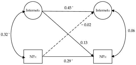 Result of the cross-lagged analyses of the relationship between internet/social media intensity and nonpharmaceutical preventive measures. Note: Internet = internet/social media intensity; NP = nonpharmaceutical preventive measures; t1 = wave 1, t2 = wave 2. * p < 0.05.