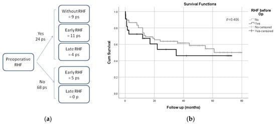 The comparison of patient survival based on RHF shows that preoperative RHF did not affect patient survival (Figure 1b). The average survival was 39.90 months (95% CI: 25.26–54.54) and 50.28 (41.76–58.80) months in non-survivors and survivors, respectively. No significant difference in the survival rate was found between these two arms (log-rank (Mantel–Cox) test, p = 0.406). In the group of 24 subjects with preoperative RHF, 50% fatal outcomes were observed, while in the group without preoperative RHF, 28 (or 41.2%) were with fatal outcomes.