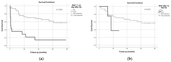 (a) Survival analysis against early RHF (7–14 days after LVAD implantation); (b) survival analysis against late RHF (>14 days after LVAD implantation).