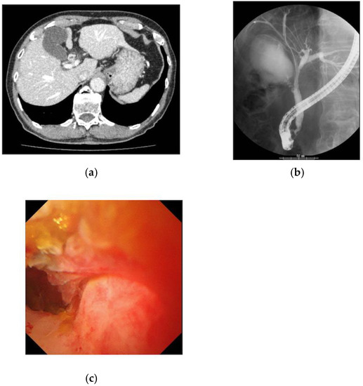 - Kawakami, H.; Kuwatani, M.; Etoh, K.; Haba, S.; Yamato, H.; Shinada, K.; Nakanishi, Y.; Tanaka, E.; Hirano, S.; Kondo, S.; et al. Endoscopic Retrograde Cholangiography Versus Peroral Cholangioscopy to Evaluate Intraepithelial Tumor Spread in Biliary Cancer. Endoscopy 2009, 41, 959–964. [Google Scholar] [CrossRef] [PubMed] [Green Version]