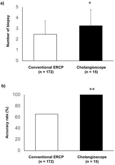 Comparison of biopsy outcomes in cases with conventional ERCP and cholangioscopy: (a) the number of biopsy specimens in cases with cholangioscopy (3.3 ± 1.5) was significantly higher than that with conventional ERCP on average, with a significant change of 2.5 ± 1.3 in cases with cholangioscopy (p = 0.043); * indicates p < 0.05; (b) the accuracy rate in cases with cholangioscopy was significantly higher than that in cases with conventional ERCP (100% and 65.7%, p = 0.003); ** indicates p < 0.01.