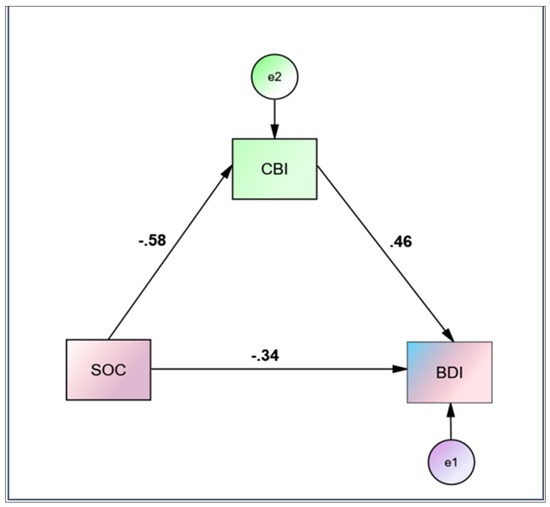 Mediation analysis of Copenhagen Burnout Inventory (CBI) on Sense of Coherence (SOC)–Beck Depression Inventory (BDI) relationship.