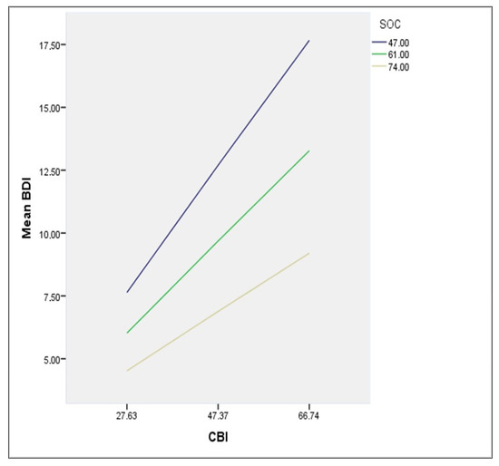 The moderation effect of SOC, between CBI and BDI relationship, at low (47) middle (61) and high (74) degree of SOC.