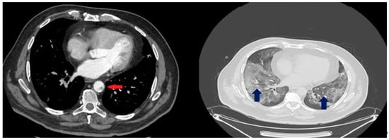 CT pulmonary scan of the patient at day 6. The blue arrows demonstrate bilateral ground glass opacities and regions with pulmonary consolidation. The red arrow indicates the thrombi detected in the thoracic aorta.