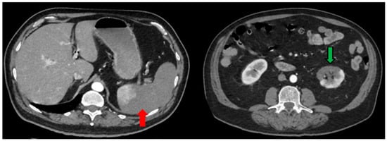 Abdominal CT scan of the patient at day 6. The red arrow demonstrates the area of hypoattenuation in the splenic parenchyma consistent with the splenic infarct. The green arrow indicates wedge-shaped parenchyma hypodensities in the lower lobe of the left kidney, typically seen in renal infarcts.