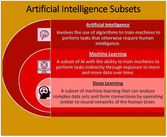 Artificial intelligence refers to the all-encompassing ability of mathematical algorithms to train machines to mimic human intelligence. With the use of programmed algorithms, machines are able to complete tasks, execute decisions, and recognize images [1]. Within AI, machine learning is a subset (Figure 1) that identifies patterns among big datasets. It has the unique ability to automatically improve analysis over time with more usage of data and experience. Essentially, machine learning works by implementing algorithms to create a model from a sample dataset without directly programming the decisions needed to be made [2]. This is particularly useful in fields such as medicine where decisions are not predictable and vary in every individual patient. Machine learning provides the opportunity to handle complex data with the ability to become more accurate over time. Machine learning itself can be classified as supervised and unsupervised (Table 1). These two techniques are applied in different situations. Particularly, supervised learning refers to when models are trained to analyze algorithms based on reference data that have already been entered. Thus, as it works from a reference dataset and applies the same pattern to a new dataset, supervised learning is very accurate [3,4]. Unsupervised learning refers to finding patterns in data on its own without any given reference. This is advantageous in finding hidden patterns that have not already been identified [3,5]. Despite its advantages, machine learning has its limitations, especially apparent when applied to the field of medicine. Specifically, machine learning can lead to bias when it comes to analyzing the dataset. This is due to the way the algorithms are organized which is to become better with more exposure to previous datasets. Therefore, this decreases the variety of data that machines have to make information other than what was previously represented [6].