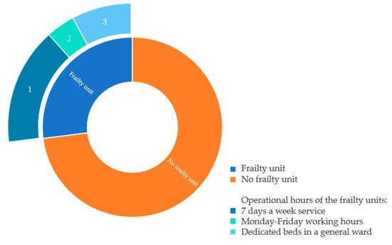 Seven hospitals (27%) reported having an acute frailty unit/service. Of these, four (57%) run a 24 h service 7 days a week (24/7). One (14%) operated only within normal working hours from Monday to Friday, and two hospitals (29%) have dedicated frailty assessment beds within a general medical ward area (Figure 1). The majority (86%) of these units used a form of frailty criteria as a screening tool. Age was another criterion used in the form of either greater than or equal to age 65 years (29%) or greater than or equal to 75 years (29%). A total of 43% used a combination of frailty and age to screen patients.