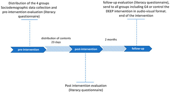 The purpose of the literacy questionnaire was to characterize participants’ knowledge about depression at pre-intervention, post-intervention and follow-up. Finally, and after receiving the follow-up responses, DEEP intervention was sent in audiovisual format to all groups, including the control group (G4). Figure 1 represents the timeline of the assessment design.