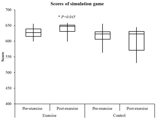 Scores of simulation game. * p ≤ 0.05 between pre- and post-exercise.