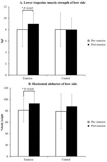 (A). Lower trapezius muscle strength of bow side; (B). Horizontal abductor of bow side. * p ≤ 0.05 between pre- and post-exercise.