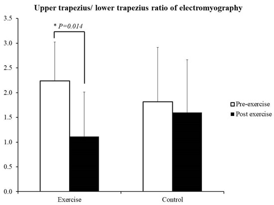 Upper trapezius/lower trapezius ratio as indicated through electromyography. * p ≤ 0.05 between pre- and post-exercise.