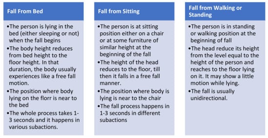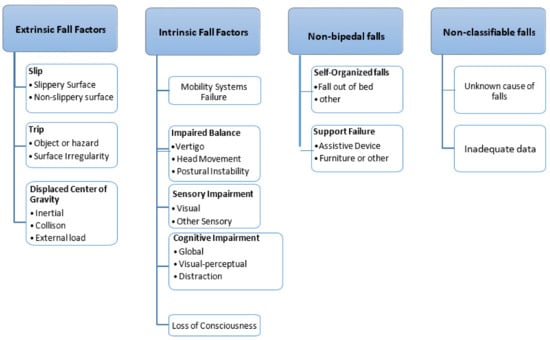 Understanding the possible risk factors responsible for falls in elderly persons is required. A better understanding of these risk factors will help in developing a better fall prevention system. Numerous factors related to biology, behavior, demographics, and environment are there that can be a cause of falls for an elderly person []. A list of risk factors has been identified through the study of relevant and published literature, as shown in Figure 1. Numerous causes are responsible for the fall of an elderly person or patient. Physiological conditions and falls from the bed are the most common cause of the fall [,,]. The authors in [] designed a reliable and flexible method for the classification of falls in the elderly. Along with that, the operational definitions for types of falls were also provided. In the proposed three-level hierarchical classification scheme, the first level consists of four major classifications. Each major classification has further subcategories which are further divided into other subcategories of level three. The detailed categorization is shown in Figure 1.