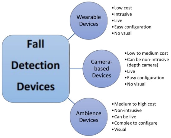 Fall detection: fall detection techniques can be classified into three basic categories: (i) wearable devices, (ii) camera-based devices, and (iii) ambience devices. The categorization of fall detection is presented in Figure 3. In the wearable devices approach, some wearable gadgets or garments need to be worn by the people at risk of a fall. These devices sense the information regarding the body posture or the movement and then some algorithm processing this information decides whether it is a fall or not. The decision is then communicated to the pre-specified caregivers. However, the use of wearable devices seems to be very intrusive and an extra overhead to some users. They do not want to bother to keep on wearing any device all the time. Moreover, there is an issue regarding the placement of the device. Some activities, such as sleeping and walking, might displace the device from its original location and may result in less accurate results.