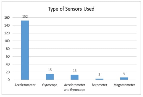 The use of accelerometer and gyroscope sensors either alone or in pairs has been the preferred choice of researchers to detect falls. In some research, the existing sensors of the devices are being exploited for fall detection, while in others, the desired sensor(s) is/are connected externally. Figure 5 shows the use of the different types of sensors in fall detection and prediction. The accelerometer sensor was used in 86% of the research works related to fall detection or prediction. Only 5% of the researchers used a barometer and magnetometer for fall detection.