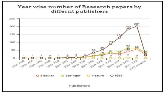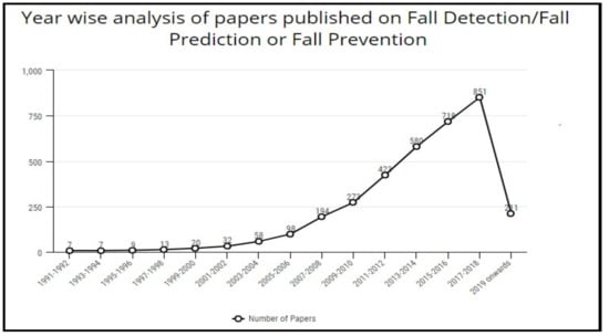 This section discusses the methodology followed for carrying out this work. The literature studied comprises the work completed as publications, patents, and funded projects or surveys in this domain in the specified time duration, as shown in Figure 4. The query used for searching is a Boolean “OR” combination of the terms “Fall Detection”, “Fall Prediction”, and “Fall Prevention”, and it should appear in the title of the publication. A number of projects/surveys and patents completed in a window of two years starting from the year 1991–92 was sought out. The process was repeated for the subsequent two-year periods until 2020. Similarly, the number of publications was identified using Google Scholar. Additionally, the publications were also categorized according to the different publishers, including Springer, Elsevier, IEEE, etc. The publications were further grouped based on the technology used to detect/predict/prevent falls. The articles that were purely concerned with clinical research were excluded. Additionally, the articles where falls were a secondary concern, and the primary concern was some pre-existing disease, were not included. The non-availability of full text and indexing in some inappropriate databases were also considered as part of the criteria for exclusion.