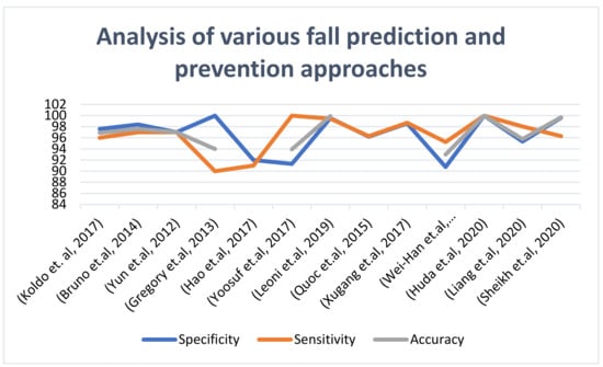 Figure 8 represents [,,] the evaluation of the different approaches developed to detect or prevent falls. The evaluation has been conducted based on the attainment percentage of three parameters: sensitivity, specificity, and accuracy. It can be observed that in some cases, the respective authors succeeded in achieving more than a 98% value for the respective parameters [,,,,,,,,].