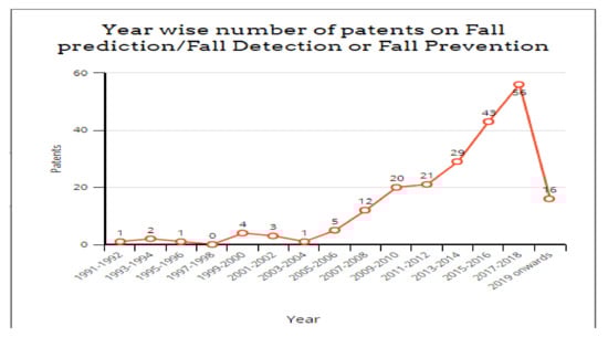 Researchers have been continuously working for the last three decades to reduce the risk and impact of falls in older people or patients. However, a comparatively fewer number of patents have been filed in this domain. The same is evident in Figure 9. The work conducted in [] shows the number of patents filed every two years since 1991 to date. Most of the patents are filed in the USA. However, [] describes the details of 0some of the patents granted in the USA and India. Table 2 gives an insight into some of the patents that have been granted in this domain.