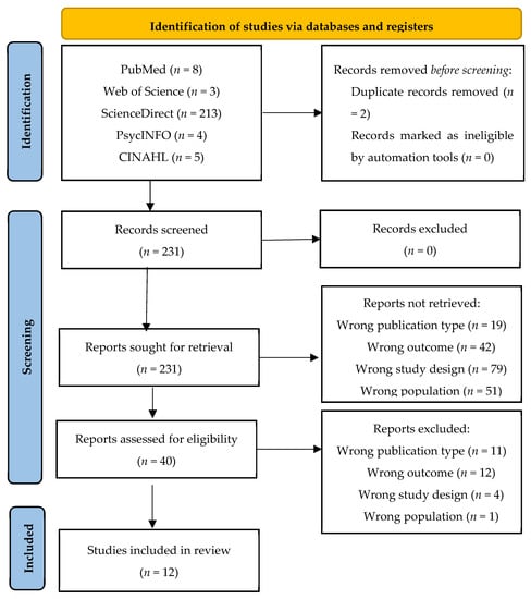 The search in the different databases provided 233 articles, which were screened to evaluate their eligibility. Of these, two were eliminated because they were duplicates. After reading the titles and abstracts, and after reading the complete articles, 12 articles were selected for their systematic review [20,21,22,23,24,25,26,27,28,29,30,31] (Figure 1).