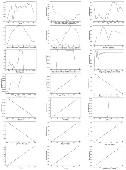 To ascertain the potential threshold of factors that can impinge upon older adults’ SRH, we used using partial dependence plots (pdps) to examine correlations between various factors and older adults’ SRH. Studies indicate that pdps can visualize the marginal effects of factors on the outcome [39].