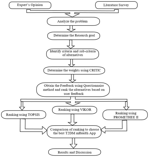 From the perspective of the user, the best T2DM mHealth applications are determined by the total usability score for each T2DM mHealth application, which is in turn determined by the quality of the T2DM mHealth applications. MCDM approaches are used to make the selection process easier. Due to its capacity to use specific criteria to evaluate numerous alternatives, MCDM is an excellent methodology for evaluating and analyzing difficult and complicated real-world situations [6]. The multi-criteria decision-making (MCDM) algorithms described in this work include TOPSIS, VIKOR, and PROMETHEE II. Criteria importance through the inter-criteria correlation (CRITIC) methodology is applied in this study. For evaluating the usability of T2DM mHealth applications, the CRITIC methodology is first utilized in order to find objective weights of all related criteria. CRITIC can effectively differentiate the properties of individual criteria by analyzing their respective strengths and evaluating criteria weights based on the relationships between them. The best alternative was chosen using a combination of criteria and sub-criteria. A variety of usability attributes and sub-attributes were employed as criteria and sub-criteria in this study. The main purpose of this study is to determine which of the T2DM mHealth apps is the most useful among the five alternatives—Glucose Buddy, mySugr, Diabetes: M, Blood Glucose Tracker, and One Touch Reveal—based on the ranking assigned by the different MCDM methods adopted in this paper, which include TOPSIS, VIKOR, and PROMETHEE II. The major contributions of this study are as follows:
