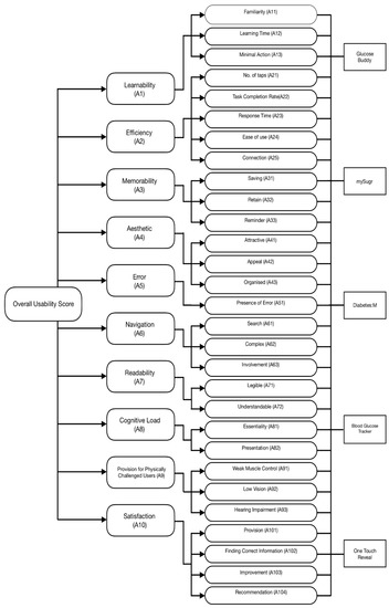 Usability is defined as “the extent to which a product can be used by specified users to achieve specified goals with effectiveness, efficiency, and satisfaction in a specified context of use” [ISO, ISO 9241-11] [33]. According to Jakob Nielsen (1993) [34], “Usability is the measure of the quality of the user experience when interacting with something—whether a website, a traditional software application, or any other device the user can operate in some way or another.” In this study, usability measures the simplicity and ease of use with which users can utilize the T2DM mHealth applications to meet their needs and satisfaction. A questionnaire-based approach is used in this study to evaluate usability. The flowchart of the proposed methodology is shown in Figure 1 below.